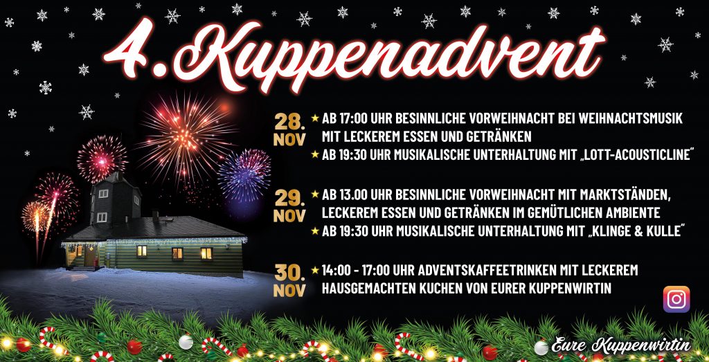 Anlässlich unseres Kuppenadvents kommt es an folgenden Tagen zu geänderten Öffnungszeiten: